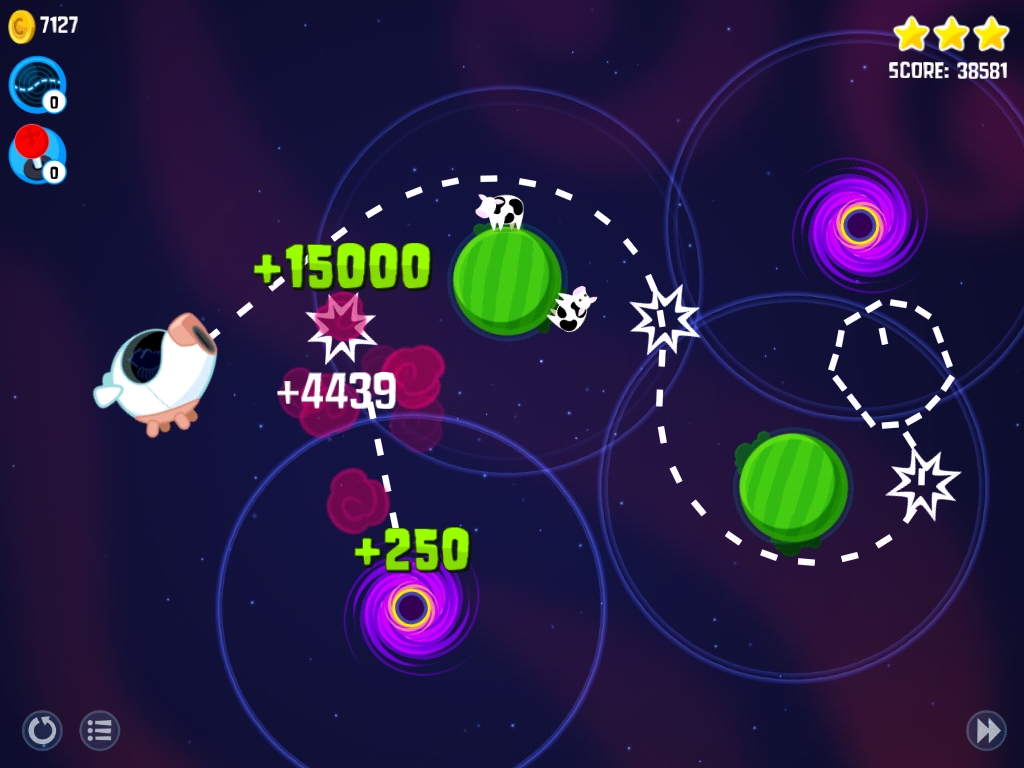 Und nicht nur die Planeten-Schwerkraft musst du bedenken. Es gibt Schwarze Löcher (extrem starke Anziehungskraft), Wurmlöcher („beamen“ die Raketen an andere Stellen) oder Asteroiden (die als „Billardkugel“ benutzt werden können), die du mit einbeziehen musst. Und natürlich darfst du bei deinen Schießereien die Kühe auf den Planeten nicht treffen, ansonsten heißt es Game Over wegen „Cowleteral Damage“.